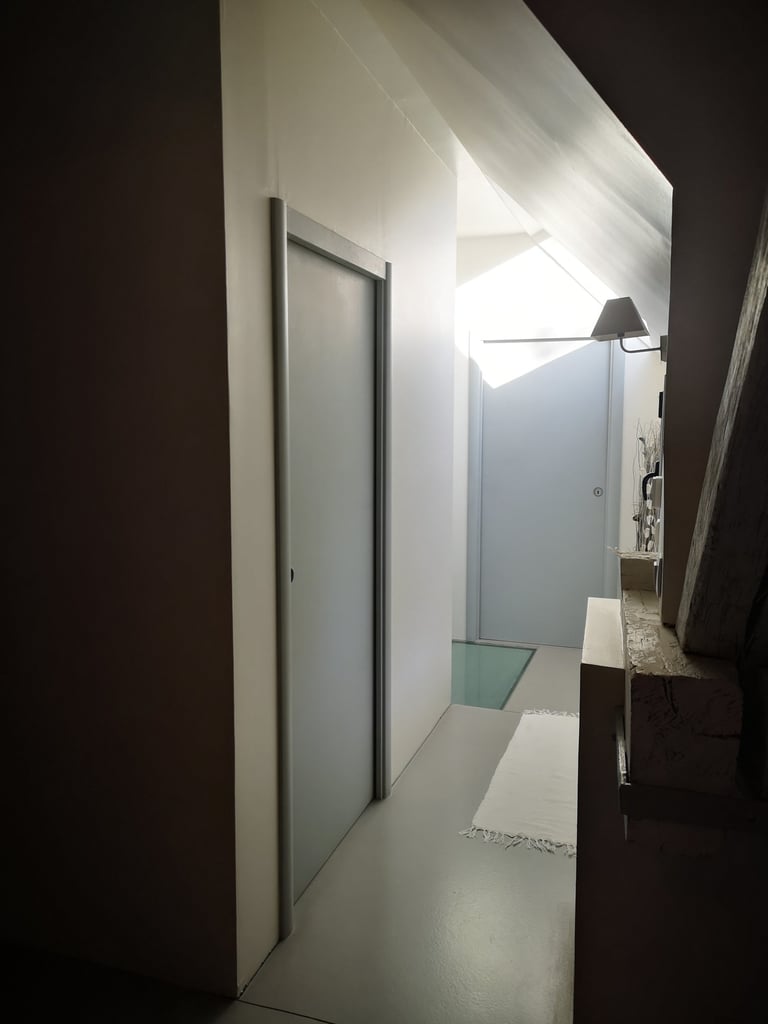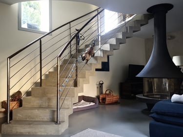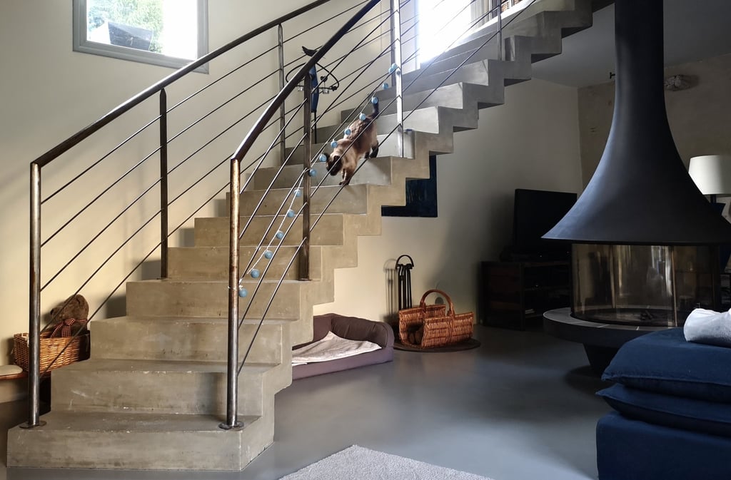 • Le remplacement complet du système de chauffage existant par une cheminée centrale contemporaine, dont le conduit vient traverser l’espace de vie des parties supérieures autour de l’escalier remarquable conservé. L’eau chaude sanitaire quant à elle est assurée par la pose d’une pompe à chaleur couplée à un ballon thermodynamique.