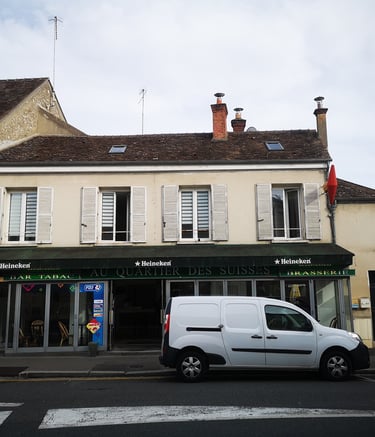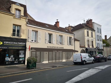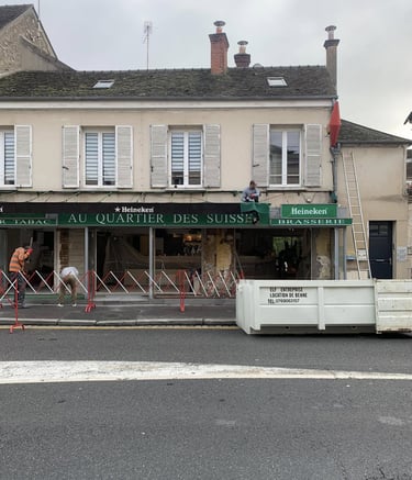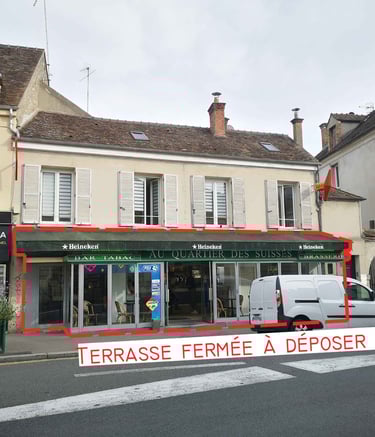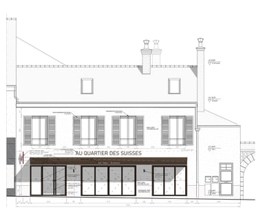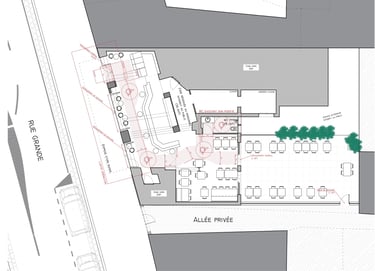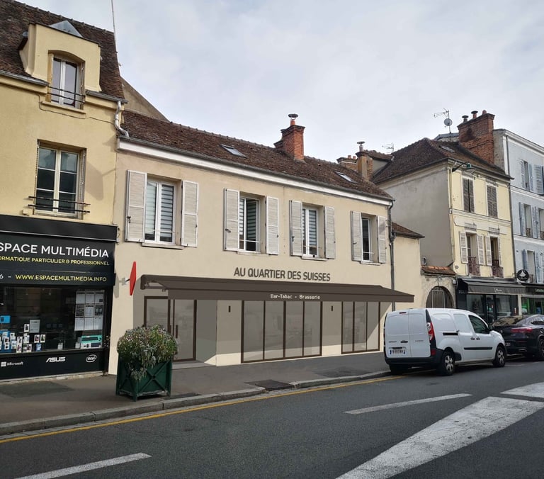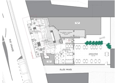Contrainte par l'obligation communale de déposer sa terrasse couverte du trottoir du centre-ville, cette brasserie historique de la commune de Fontainebleau s'est retrouvée devant le défi de redéfinir ses moyens d'accès à son commerce, retravailler son image sur la rue et remettre aux normes d'accessibilité et de sécurité incendie l'ensemble de son établissement.