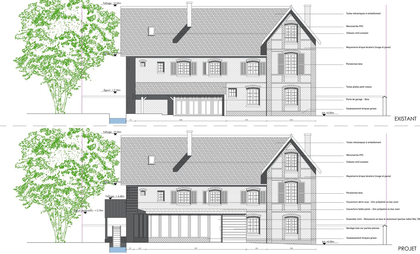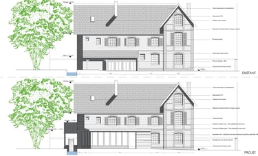 • L’extension et la rénovation de la maison de maître à destination de gîtes. L’opération comprend notamment la création d’une extension à ossature bois de 45m² SP, en quasi lieu et place du auvent de garage existant, l’aménagement des combles avec création d’une lucarne rampante en pans de bois traditionnels, la réfection et mise en protection derrière bardage bois du pignon Nord, dont la maçonnerie en brique à proximité immédiate du cours d’eau et l’ orientation plein Nord soumise aux intempéries présente un état de vétusté préoccupant, ainsi que la rénovation et l’ aménagement intérieur de la maison.