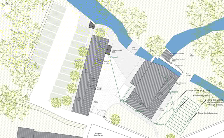 • La révision complète du système de chauffage et d’assainissement, par la mise en place d’une pompe à chaleur géothermique alimentée par la turbine du cours d’eau naturellement présent sur le site, ainsi que la réfection complète de l’assainissement individuel des réseaux EU, EP et EV.
